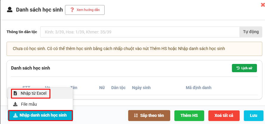 Bước 1: Bấm vào nút Nhập danh sách học sinh -> chọn File mẫu